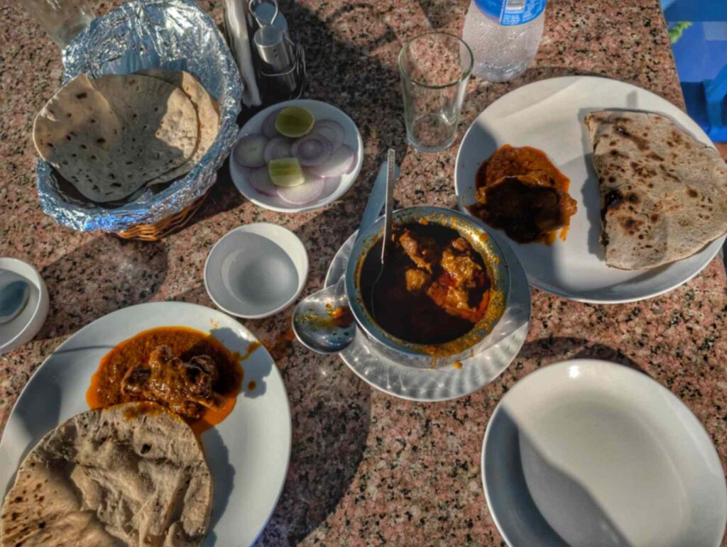 For my non-vegetarian adventure, I climbed up to Gopal Rooftop Restaurant for their famous Lal Maas. This place offers a spectacular view of Mehrangarh Fort, especially magical during monsoon evenings when the fort is shrouded in dramatic clouds.